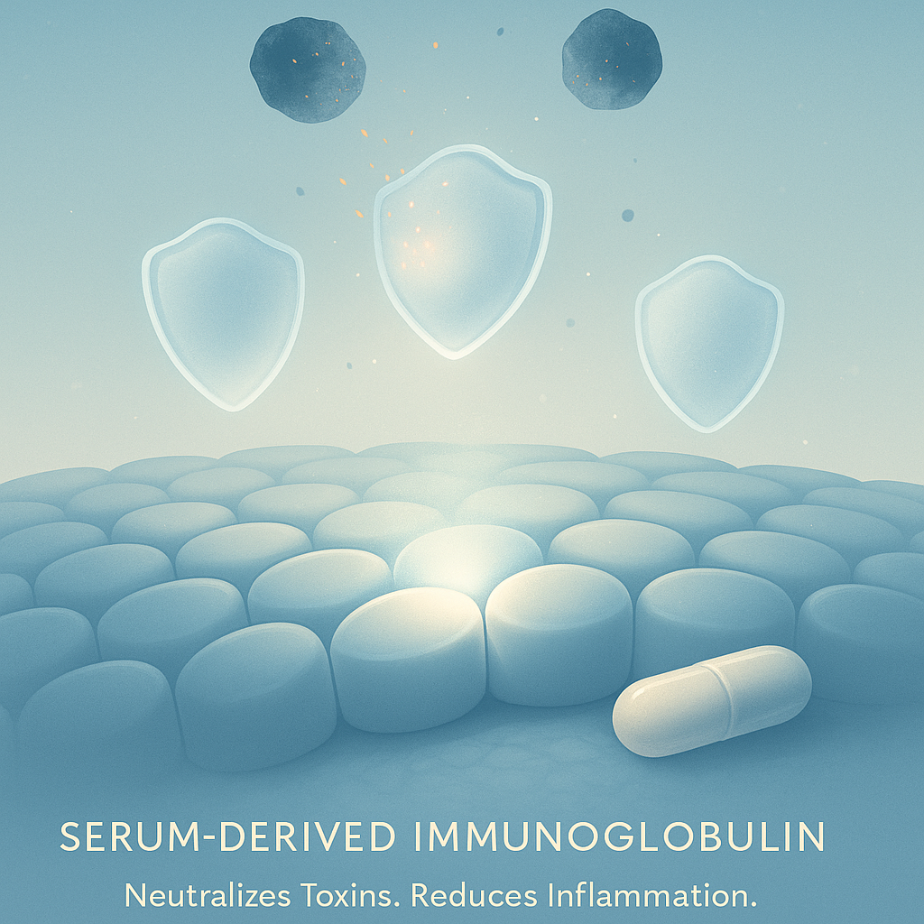 Concentrated immunoglobulin G (IgG) proteins from bovine serum act as molecular cleanup crews binding to toxins, harmful bacteria, and pathogens at the gut barrier level before they can trigger inflammation or cross into your bloodstream.
